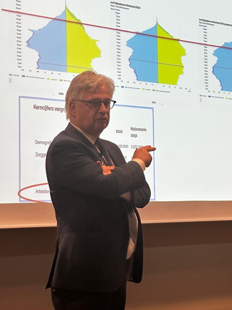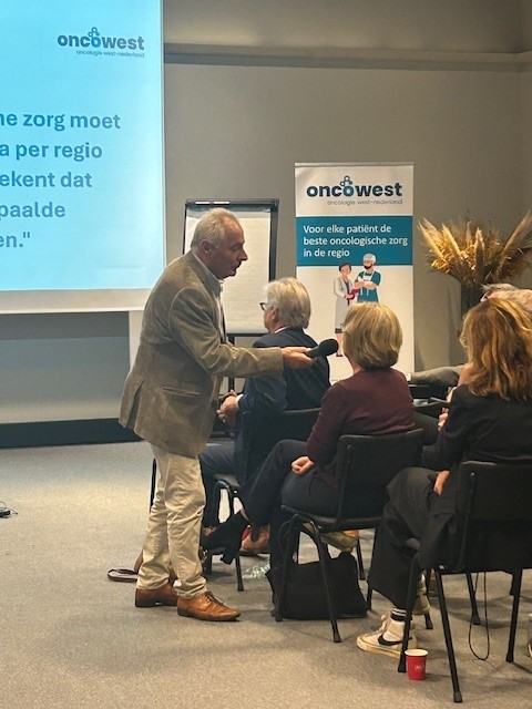 Rob Tollenaar, voorzitter Ronde Tafel toekomstbestendig zorglandschap door concentratie en spreiding vertelde over de nieuwe netwerknormen in de oncologie en de veranderingen die plaats gaan vinden. Het belang van concentratie en spreiding werd toegelicht en volgens Rob is het niet houdbaar om door te gaan via de huidige weg en moet er écht iets veranderen. Op dit moment hebben de OncoWest ziekenhuizen tranche 1 afgerond. De andere zes oncologienetwerken in Nederland zijn in de afrondende fase van tranche 1. De verwachting is dat tranche 2 in 2026 start. Maar daarop wachten hoeft volgens Rob niet: “Niets staat de ziekenhuizen in de weg om nu alvast voorbereidingen te treffen voor tranche 2.” De regio zou bijvoorbeeld al naar de bestaande SONCOS normen over  volumes kunnen kijken.