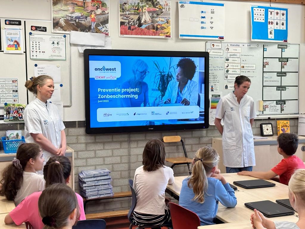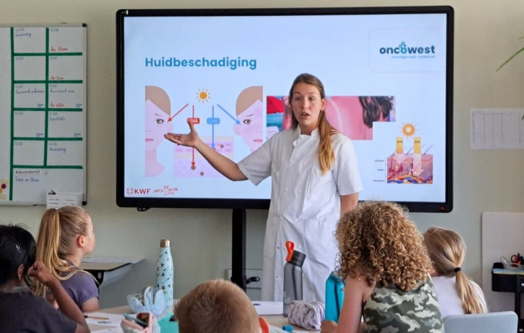 Elise Duijvestijn is werkzaam als verpleegkundig specialist oncologie in het Haaglanden Medisch Centrum en lid van het OncoWest expertteam Huidkanker. Ze stond deze week voor de klas bij Kindcentrum BuitenRijck in Rijswijk en gaf uitleg aan de kinderen en beantwoordde hun vragen. Ze grijpt deze kans om met de kinderen te praten graag aan: ‘Het aantal mensen met huidkanker neemt nog steeds toe. En onze boodschap is, bescherm uw kind en ook uzelf.’