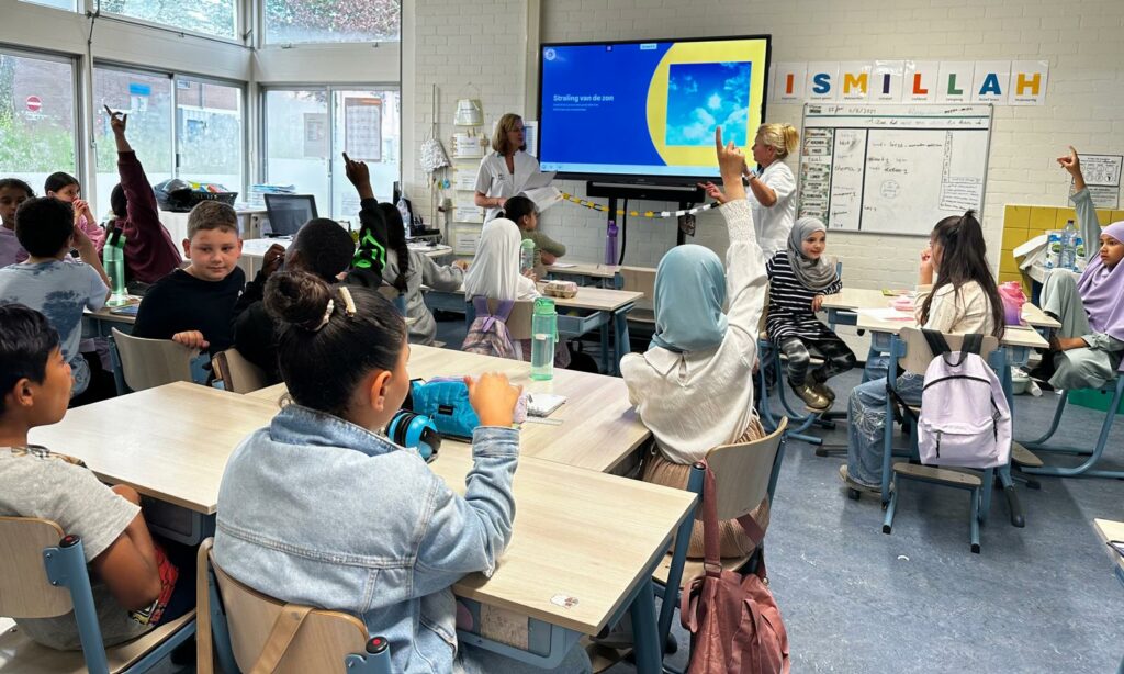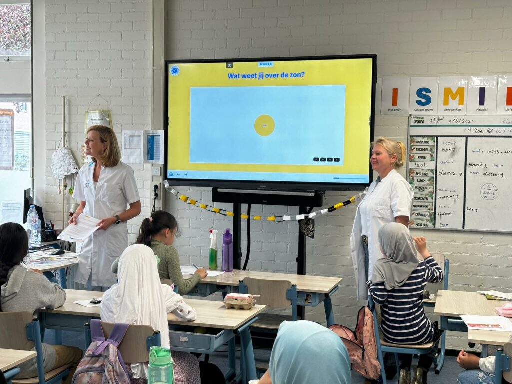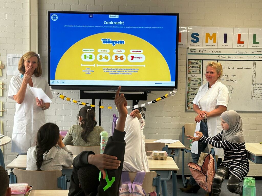 Op initiatief van OncoWest bezochten Pauline Keunen (verpleegkundig specialist in het HMC) en Ilse Jannink (oncologisch chirurg in het HagaZiekenhuis) de groepen 5, 6, 7 en 8 van basisschool Yunus Emre in Zoetermeer. Met het lespakket van het Huidfonds vertelden ze de kinderen alles over zonpreventie: hoe kun je zonnebrand voorkomen en het risico op huidkanker zo klein mogelijk maken?